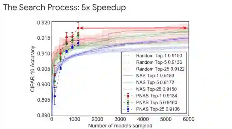 答案肯定是,是的。在下图中,我把我们的渐进式神经网络结构搜索跟 Random Rearch 和 NAS 进行了比较: