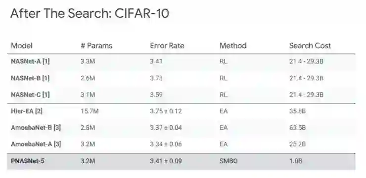 第二,我们将最后搜索出来的结果叫做 PNASNet-5 ,它在 CIFAR-10 和 ImageNet 上达到了非常高的准确率,且在搜索过程中比当下最好的增强学习和进化算法的方法都更快。