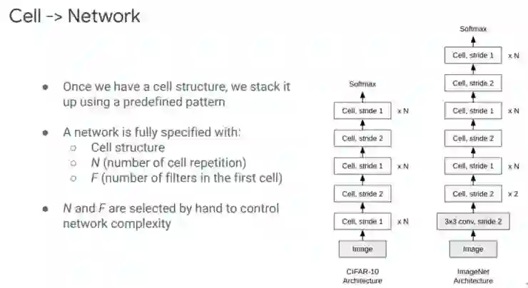 从 Cell 到 Network 的过程,如右图所示,就是有了一个 Cell structure 后,组建整个 Network,整个过程借鉴了 ResNet 的设计。