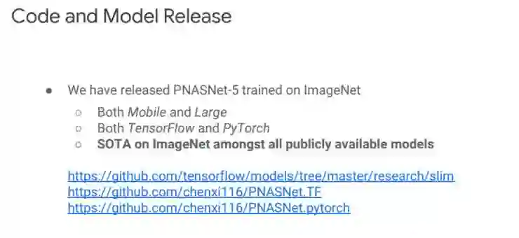 我们在 ImageNet 上训练好的 PNASNet-5 模型已经 release 了,包括刚刚提到在 ImageNet 上的 Mobile、 Large 模型,Both TensorFlow 、PyTorch 模型,以及(据我所知)在 ImageNet 所有对外开放的模型中准确度和效率最高的 SOTA 模型,大家如果有需要可以到相应网址找到。