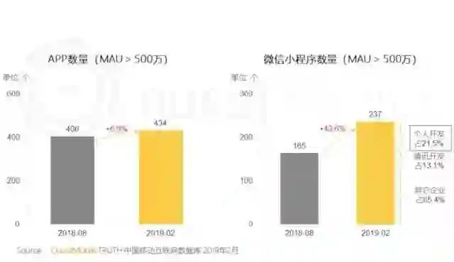 截至 2019 年 2 月,国内每日活跃使用人数超过 500 万的移动应用在过去半年内增长了 6.9%,而每日活跃使用人数超过 500 万的微信小程序数量则增长了 43.6%。