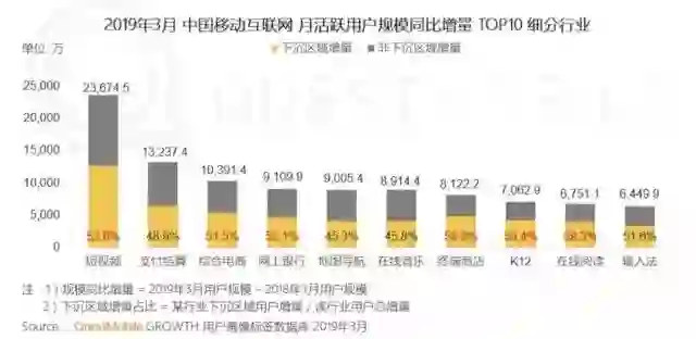 在用户增长方面,全国每月活跃用户增长前 10 的行业中,前 6 个行业的新增用户中有一半左右来自三线或三线以下城市。以短视频行业为例,过去一年里来自三线或三线以下城市新增用户的比例为 46.4%。
