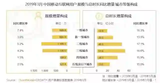 从总用户时长的增量城市构成来看,三四线及四线以下城市城市用户贡献的增量也超过了一线、新一线和二线城市,同比增速都在 15% 以上。