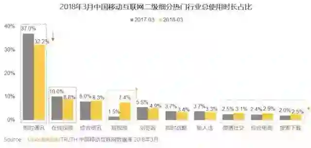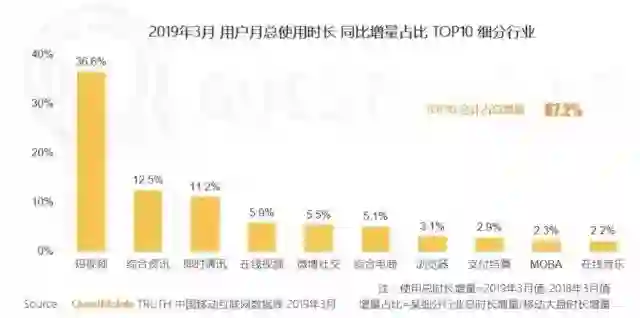 在具体的行业方面,短视频类应用总使用时长占比从去年的第 4 位上升至今年的第 1 位,综合资讯类应用也出现略微上升,从去年的第 3 位上升至今年的第 2 位,即时通讯类应用则从去年的第 1 位下降至第 3 位。