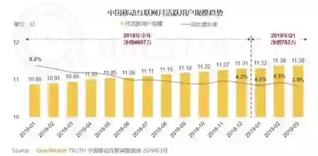 QuestMobile 发布了《 2019 年春季大报告》,2019 年 1-3 月,全国移动互联网新增每月活跃用户数量只有 762 万,不及 2018 年平均每季度超过 1000 万的用户增量。