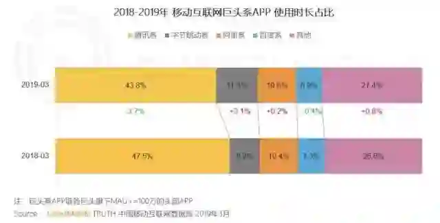 腾讯的产品依然占据着移动互联网用户最多的使用时间,但是已经出现下滑。据 Quest Mobile 统计,用户使用腾讯系应用的时长占使用所有移动应用的市场比例比去年同期下降了 3.7%,这一份额主要被抖音抢去:字节跳动系产品时长凭借着抖音的持续增长,增长了 3.1%。百度系产品也出现略微下降,阿里系产品和其它产品的增长都不到 1%。