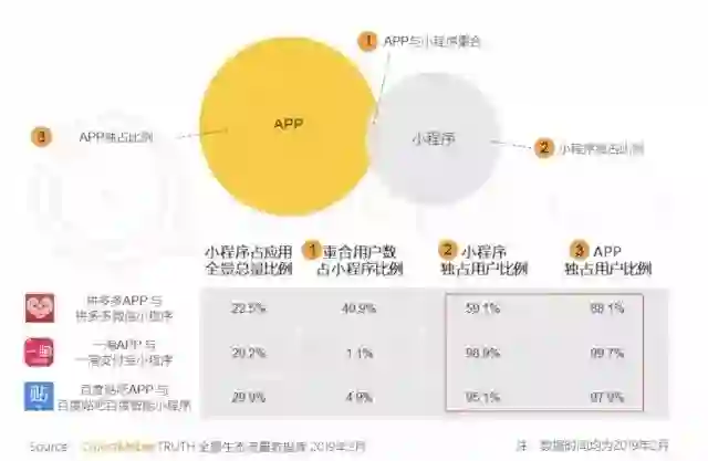 阿里的一淘应用与一淘支付宝小程序用户的重合比例只有 1.1%,百度贴吧与百度智能小程序的用户重合比例为 4.9%。拼多多应用和微信小程序用户重合比例较高,但也不超过 50%。