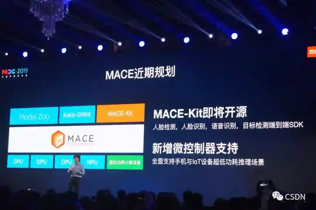紧接着,崔宝秋博士带来了小米多项重磅发布,首先便是已经为开发者们所熟知的 MACE。MACE 于去年 6 月开源,到今天,MACE 在小米的平台上、各个设备上,已经实现每天调用推理 50,000,000 次数。在 0.12.0 中,MACE 为开发者带来了更丰富的异构计算算子,新增 Kaldi 语音识别算子支持、CMake 支持,并降低跨设备运行性能损失。