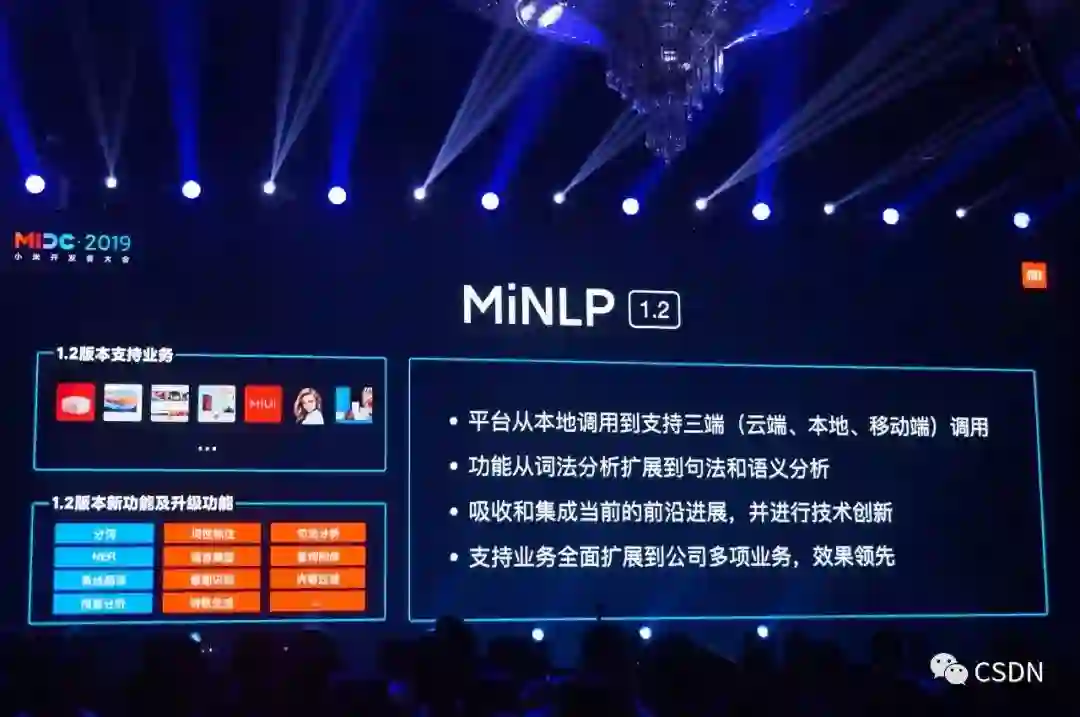 崔宝秋表示,NLP 小米积累已久,小米在 12 年开始就大力布局 NLP,去年,中国科学院信息工程研究所研究员、博士生导师王斌正式加入小米集团,任职 AI 实验室自然语言处理首席科学家,崔宝秋谈起王斌教授加入小米的第一件事,也是最重要的一件事就是「重新打造治理小米 NLP 平台」,在今天,崔宝秋正式宣布了 MiNLP 1.2 发布。
