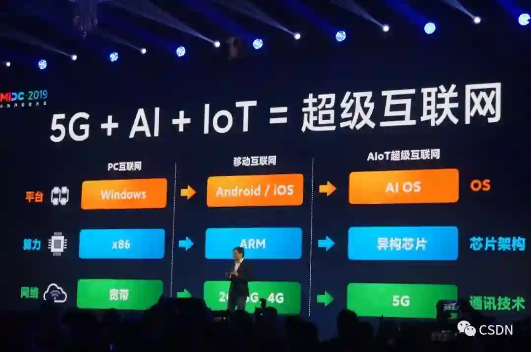 走过 PC 时代,在移动互联网时代顺势而为再度证明了自己的雷军,正式提出了 AIoT 超级互联网。雷军表示,这不仅是连接设备数量的提升,更在于底层结构变化。在超级互联网时代,必然是平台操作系统、算力芯片和网络通讯技术的升级换代,这将是一个巨大机会,有机会诞生新的一批百亿甚至千亿美金的公司。