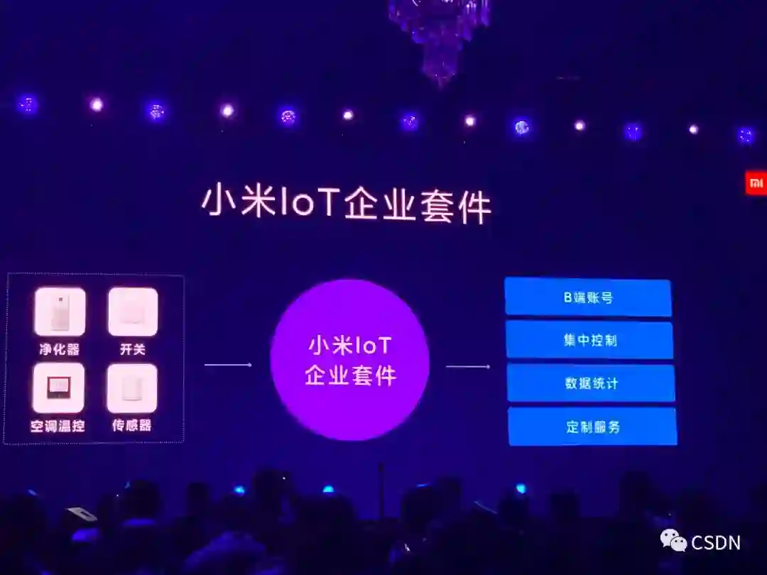 小米 IoT 企业套件为企业提供 B 端账号,对企业购置的净化器、开关、空调温控、传感器进行集中控制、数据统计,同样可实现定制服务。