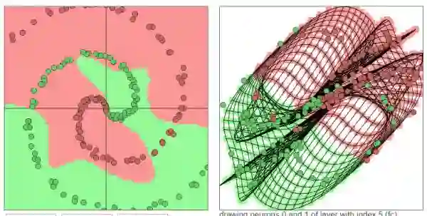 最终的扭曲效果是所有绿点都被扭曲到了一侧,而所有红点都被扭曲到了另一侧。这样就可以线性分割(用超平面(这里是一个平面)在中间分开两类)