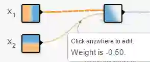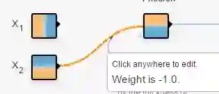 连接线:表示权重,蓝色表示用神经元的原始输出,黄色表示用负输出。深浅表示权重的绝对值大小。鼠标放在线上可以看到具体值。也可以更改。在(1)中,当把输出的一个权重改为 - 1 时,