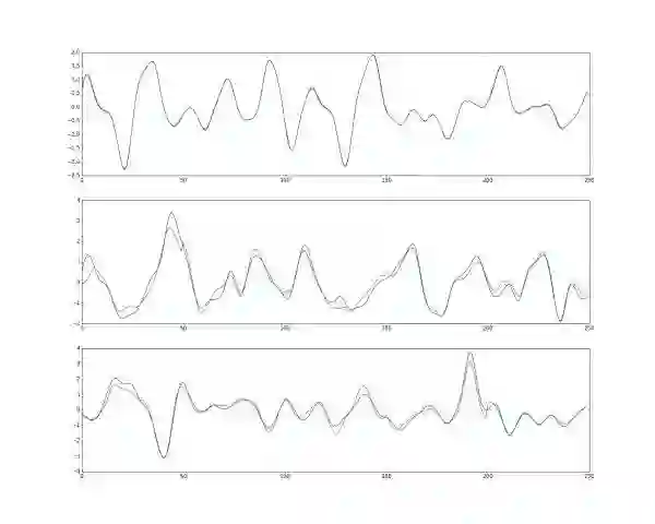 预测新值:训练过所有样本后,打乱样本顺序再次训练若干次。训练完毕后,当再来新的数据 input,就可以利用训练的网络来预测了。这时的 output 就是效果很好的预测值了。下图是一张实际值和预测值的三组对比图。输出数据是 48 维,这里只取 1 个维度来画图。蓝色的是实际值,绿色的是实际值。最上方的是训练数据的对比图,而下方的两行是神经网络模型从未见过的数据预测对比图。(不过这里用的是 RNN,主要是为了让大家感受一下效果)