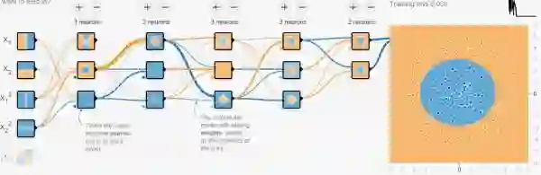 上图中所有在黄色背景颜色的点都会被分类为 “黄点 “,同理,蓝色区域被分成蓝点。在上面的分类分布图中你可以看到每一层通过上一层信息的组合所形成的。权重(那些连接线)控制了 “如何组合”。神经网络的学习也就是从数据中学习那些权重。Tensorflow playground 所表现出来的现象就是 “在我文章里所写的 “物质组成思想”,这也是为什么我把 Tensorflow playground 放在了那一部分。