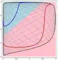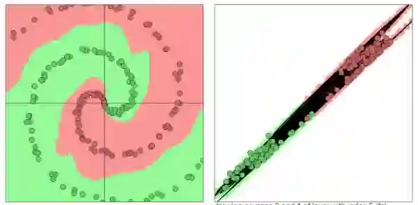 左侧是原始输入空间下的分类图,右侧是转换后的高维空间下的扭曲图。