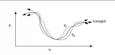 计算梯度:从 loss 开始反向传播计算每个参数(parameters)对应的梯度(gradients)。这里用 Stochastic Gradient Descent (SGD) 来计算梯度,即每次更新所计算的梯度都是从一个样本计算出来的。传统的方法 Gradient Descent 是正向传递所有样本来计算梯度。SGD 的方法来计算梯度的话,loss function 的形状如下图所示会有变化,这样在更新中就有可能 “跳出” 局部最小值。