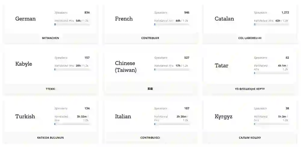 Common Voice 并不景气的收集进度(https://voice.mozilla.org/en/languages)