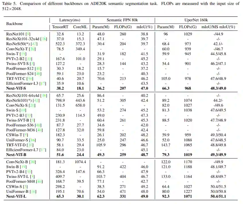 该研究将 Next-ViT 与 CNN、ViT 和最近一些混合架构针对语义分割任务进行了比较。如下表 5 所示,大量实验表明,Next-ViT 在分割任务上具有出色的潜力。