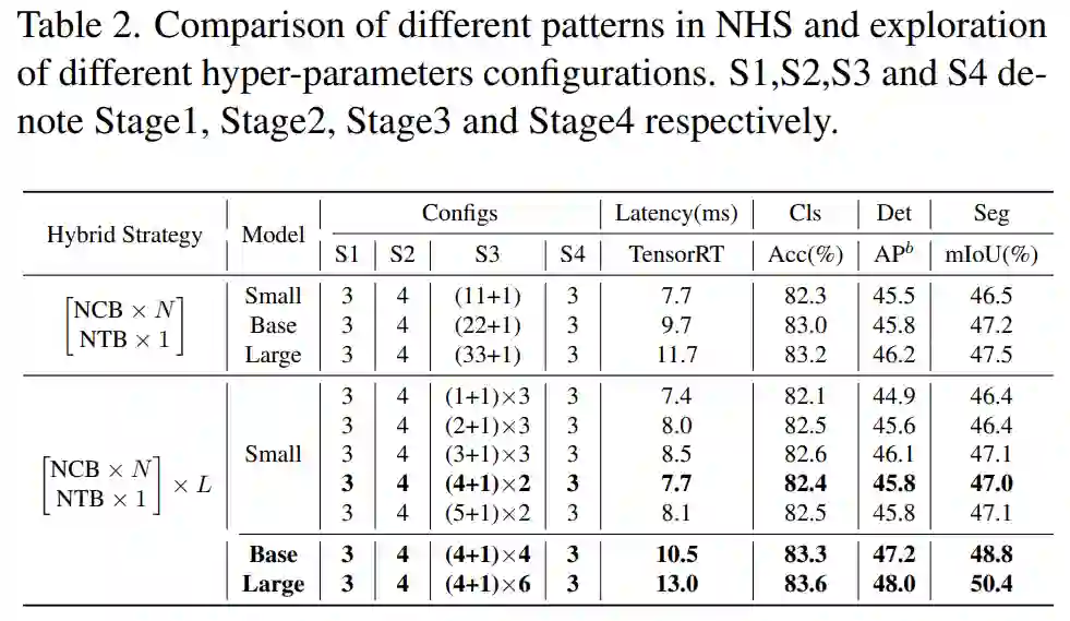 如表 2 所示,第三阶段 N = 4 的模型实现了性能和延迟之间的最佳权衡。该研究通过在第三阶段扩大 (NCB × 4 + NTB × 1) × L 模式的 L 来进一步构建更大的模型。如表 2(下)所示,Base(L = 4)和 Large(L = 6)模型的性能相对于小模型有显著提升,验证了所提出的(NCB × N + NTB × 1)× L 模式的一般有效性。