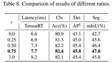 对于 NTB 块,该研究探讨了 NTB 的收缩率 r 对 Next-ViT 整体性能的影响,结果如下表 8 所示,减小收缩率 r 将减少模型延迟。
