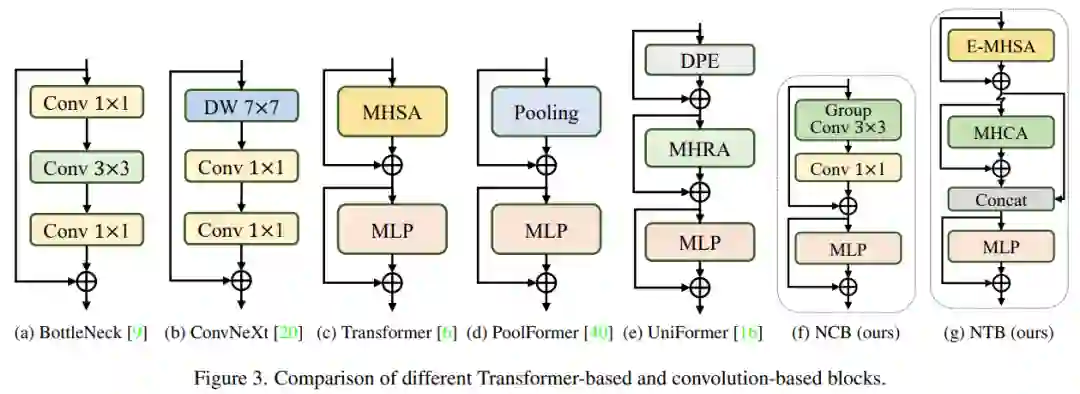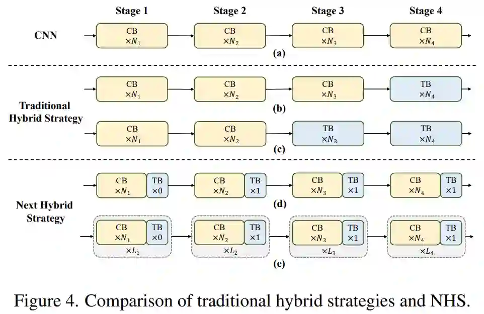 研究者首先深入设计了信息交互的核心模块,并分别开发强大的 NCB 和 NTB 来模拟视觉数据中的短期和长期依赖关系。NTB 中还进行了局部和全局信息的融合,进一步提高了建模能力。最后,为了克服现有方法的固有缺陷,该研究系统地研究了卷积和 Transformer 块的集成方式,提出了 NHS 策略,来堆叠 NCB 和 NTB 构建新型 CNN-Transformer 混合架构。