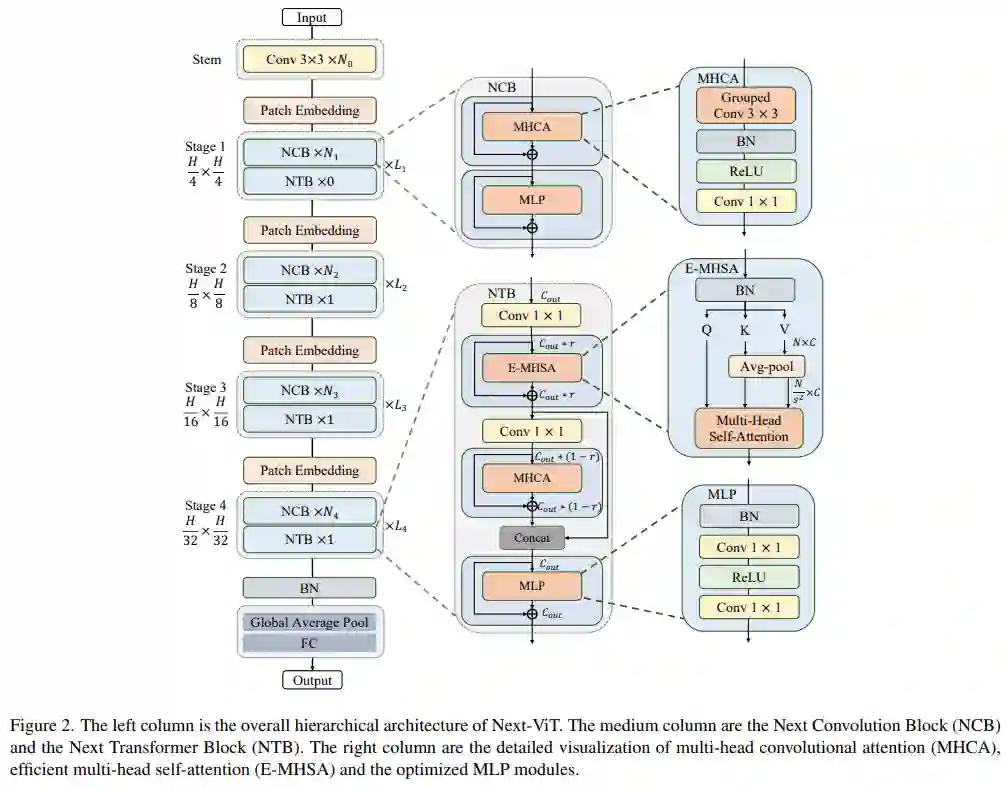 Next-ViT 的整体架构如下图 2 所示。Next-ViT 遵循分层金字塔架构,在每个阶段配备一个 patch 嵌入层和一系列卷积或 Transformer 块。空间分辨率将逐步降低为原来的 1/32,而通道维度将按阶段扩展。