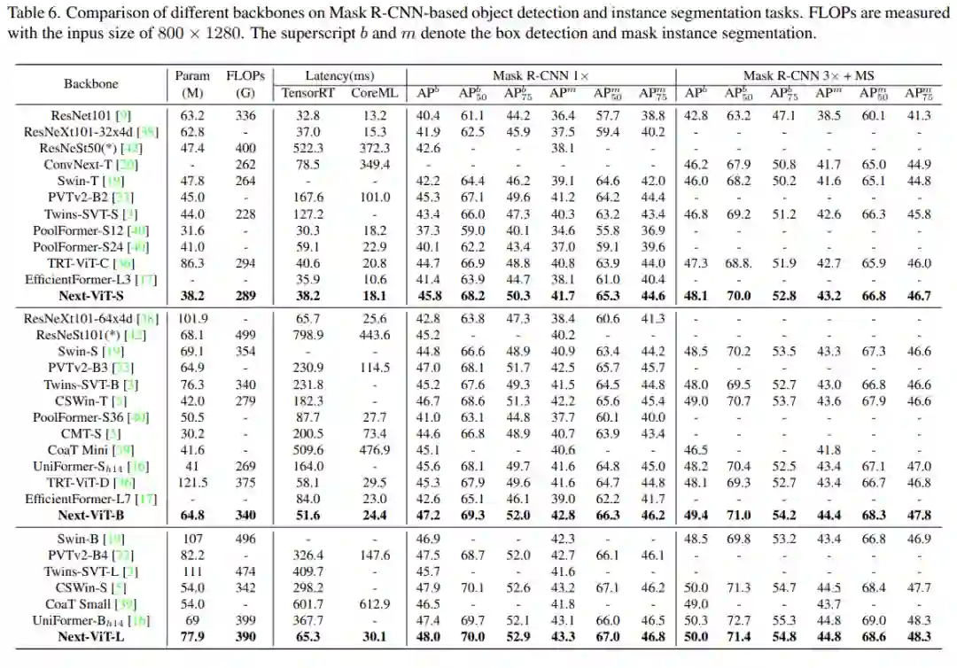 在目标检测和实例分割任务上,该研究将 Next-ViT 与 SOTA 模型进行了比较,结果如下表 6 所示。