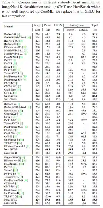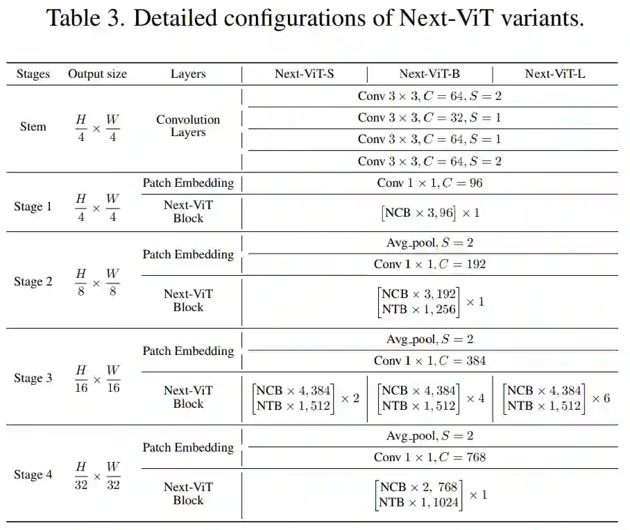 最后,为了提供与现有 SOTA 网络的公平比较,研究者提出了三个典型的变体,即 Next-ViTS/B/L。