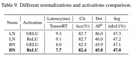 该研究进一步分析了 Next-ViT 中不同归一化层和激活函数的影响。如下表 9 所示,LN 和 GELU 虽然带来一些性能提升,但在 TensorRT 上的推理延迟明显更高。另一方面,BN 和 ReLU 在整体任务上实现了最佳的延迟 / 准确性权衡。因此,Next-ViT 统一使用 BN 和 ReLU,以便在现实工业场景中进行高效部署。