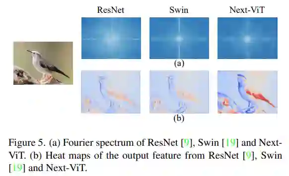 最后,该研究可视化了 ResNet、Swin Transformer 和 Next-ViT 的输出特征的傅里叶谱和热图,如下图 5(a) 所示。ResNet 的频谱分布表明卷积块倾向于捕获高频信号、难以关注低频信号;ViT 擅长捕捉低频信号而忽略高频信号;而Next-ViT 能够同时捕获高质量的多频信号,这显示了 NTB 的有效性。