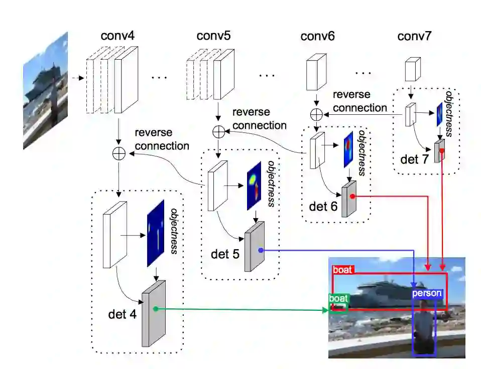 这两个解决方案的成功,也引出了一个关键问题:是否可能开发一个能够巧妙地结合两种方法的优势并消除其主要缺点的良好框架?通过弥合基于区域的和不基于区域的方法之间的 gap,研究者对这一问题进行了回答。为了实现这一目标,研究者关注两个基本问题:(a)多尺度对象定位。各种尺度的物体可能出现在图像的任何位置,因此应考虑成千上万个具有不同位置/尺度/方位的区域。先前的研究表明,多尺度表征将显著改善各种尺度的物体检测。然而,这些方法总是在网络的一层检测到各种尺度的对象。利用研究者提出的反向连接,对象将在其相应的网络尺度上被检测到,这更容易优化;(b)负空间挖掘(Negative space mining)。对象和非对象样本之间的比例严重不平衡。因此,对象检测器应该具有有效的负挖掘策略。为了减少对象搜索空间,研究者在卷积特征图上创建了 objectness prior,并在训练阶段用检测器联合优化。