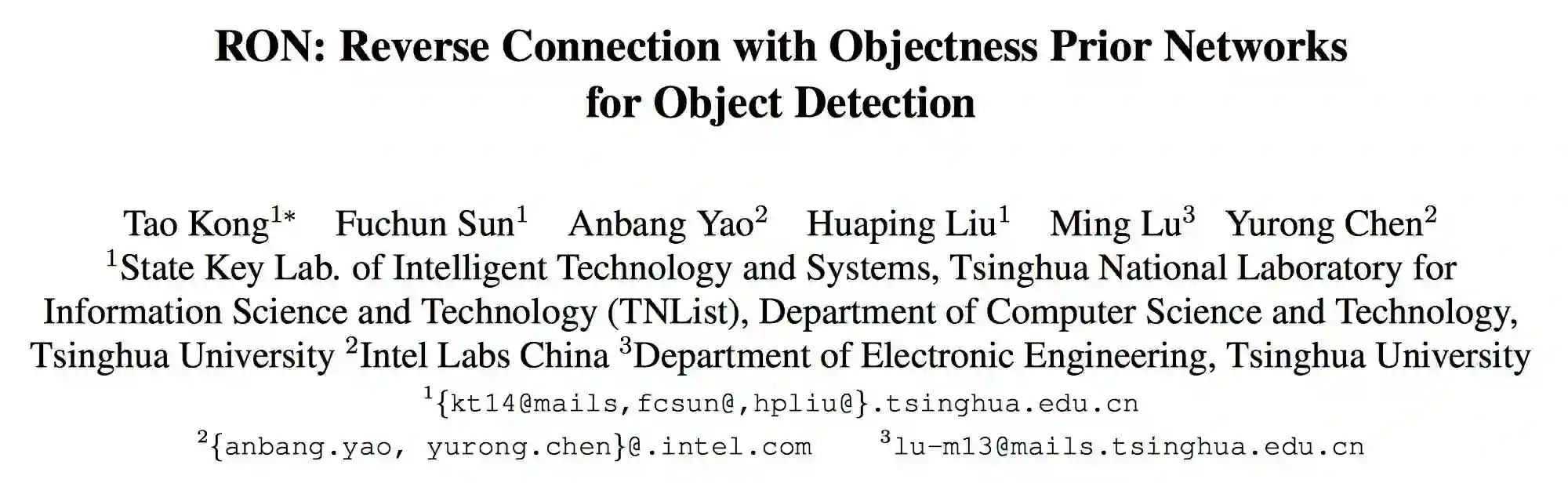 我们提出了 RON,一个有效、高效的通用对象检测框架。我们的想法是巧妙地结合基于区域(region-based,例如 Faster R-CNN)和不基于区域(region-free,例如 SSD)这两种方法的优点。在全卷积架构下,RON 主要关注两个基本问题:(a)多尺度对象定位和(b)负样本挖掘。为了解决(a),我们设计了反向连接,使网络能够检测多层 CNN 中的对象。为了处理(b),我们提出了 objectness prior,显著减少对象搜索空间。我们通过多任务损失函数联合优化了反向连接、objectness prior 和对象检测,因此RON 可以直接预测各种特征图所有位置的最终检测结果。