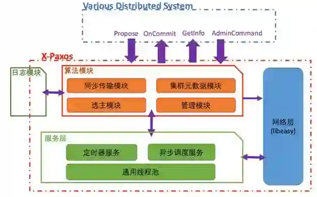 X-Paxos的整体架构如上图所示,主要可分为网络层、服务层、算法模块、日志模块4个部分