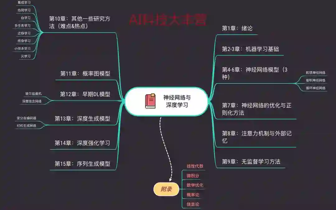 全书正文共分为十五章,附录还有 5 个部分帮助大家补习需要的数学基础知识,AI科技大本营为大家整理了一份全书大纲,希望可以帮助大家最快速度掌握全书的脉络,制定自己的学习计划!相信大家一定会看得开心,有收获!下面就为大家送上这本书的地址,好资源别忘了给邱教授点个 Star!