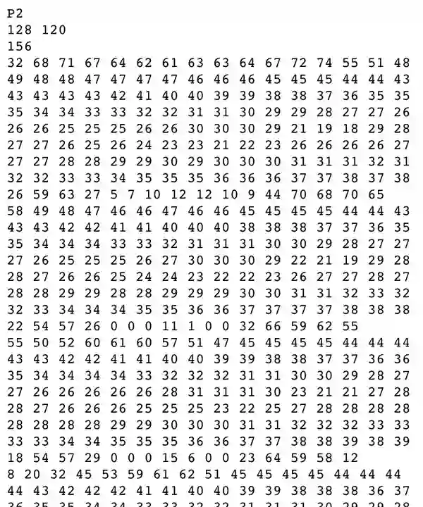 pgm是一个缩写,全称:Portable Gray Map。这是一种灰度图像格式,与常见的jpg格式相比,pgm不对数据进行压缩,因而体积较大。