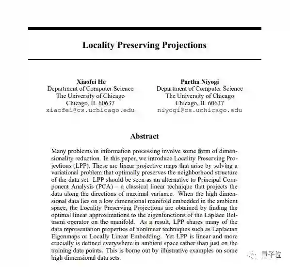 在这篇论文中,他们提出了保局投影(LPP)的算法,并利用数据集进行了证明。被引用了4000多次。这也是最早中标NIPS的中国籍学者论文。