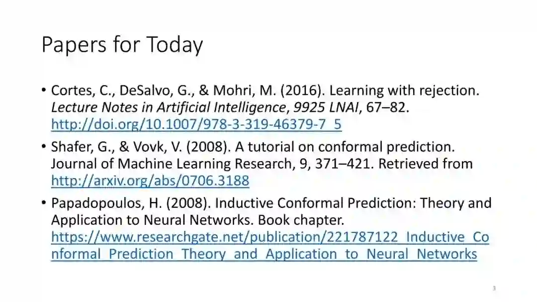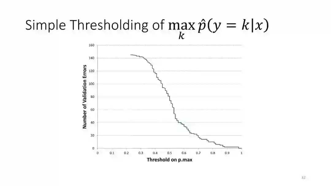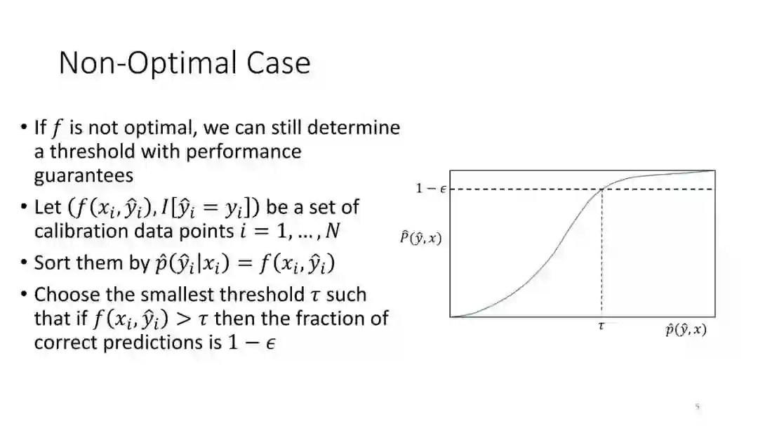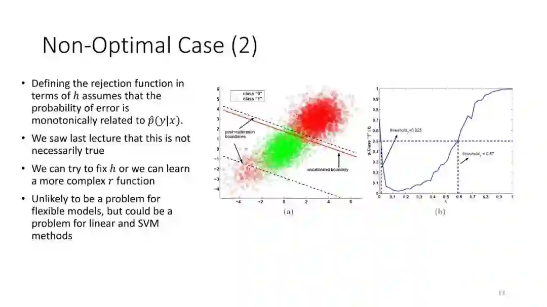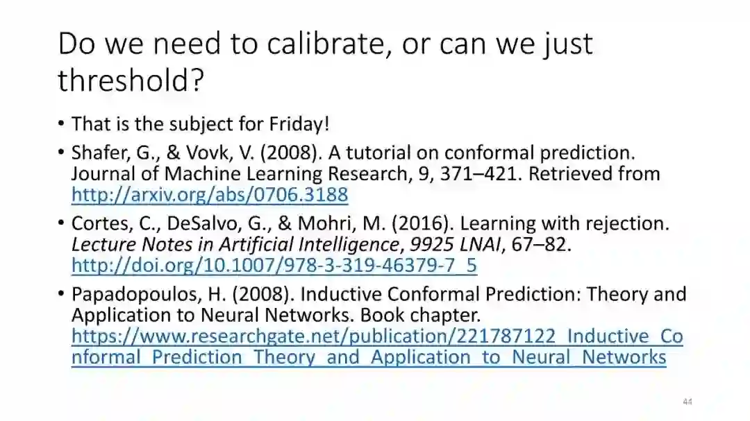 第2讲:带有拒绝选项的分类。为了正确地做出拒绝决策,我们不需要获得经过校准的概率。这节课讨论了设置拒绝阈值的方法,该阈值提供了准确性保证。这包括标准的阈值法和保角预测法。