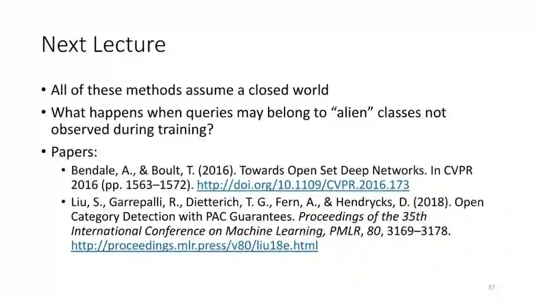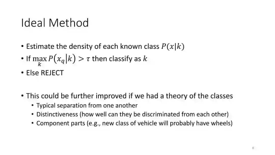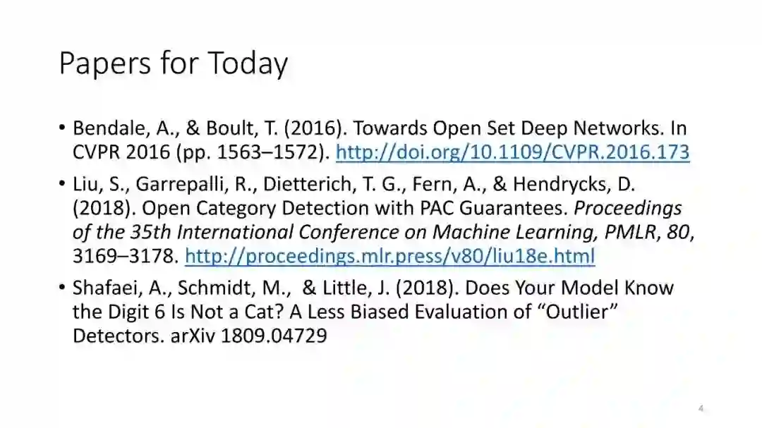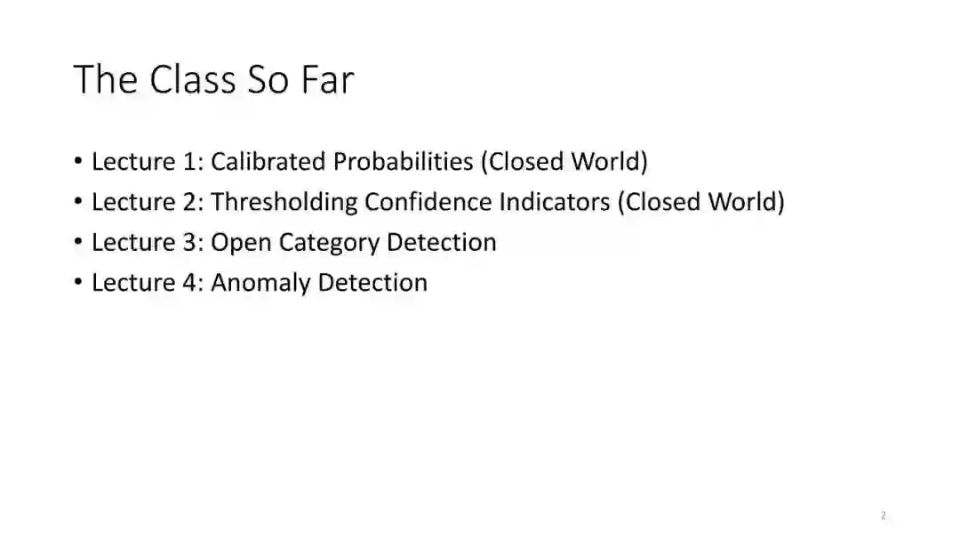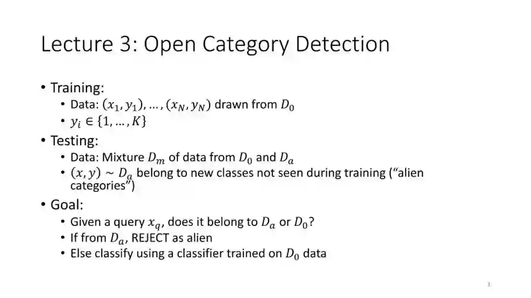 第3讲:开放类别检测。前两讲仅考虑了具有iid训练数据的封闭世界的情况。在本节课中,我们讨论了检测属于不存在于训练数据中的类的测试查询的问题。
