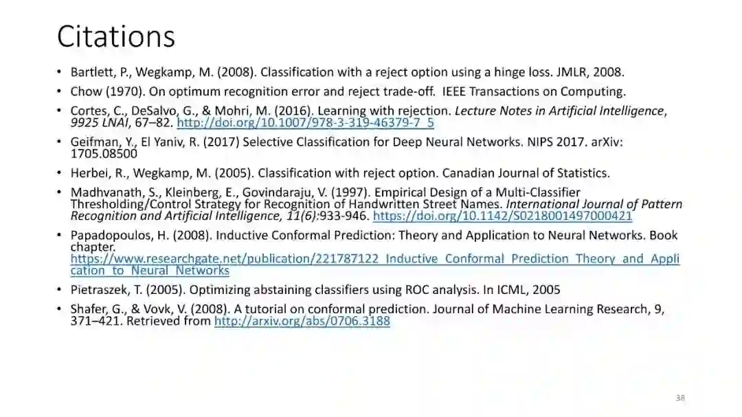 这个短期课程讨论了从有监督的机器学习中获得可靠决策的问题。它试图总结关于我们如何创建机器学习分类器的当前知识,这些分类器在进行预测时可以保证预测的正确性和高概率性。这些分类器拒绝测试查询,因为它们对这些查询没有足够的信心。本课程由四节课组成,每节课以最近最新的一些论文为中心,但也包括其他出版资料。