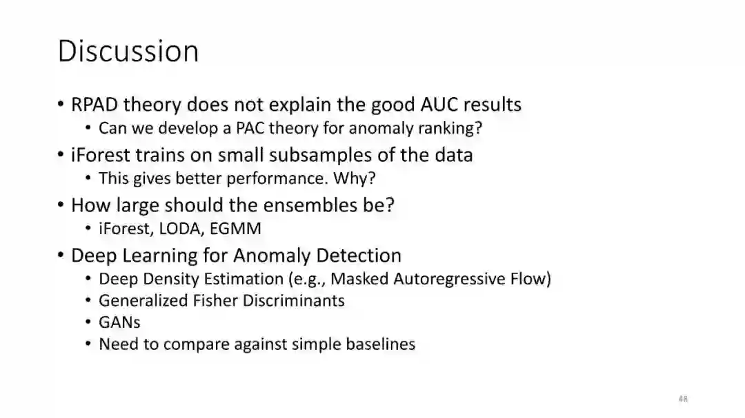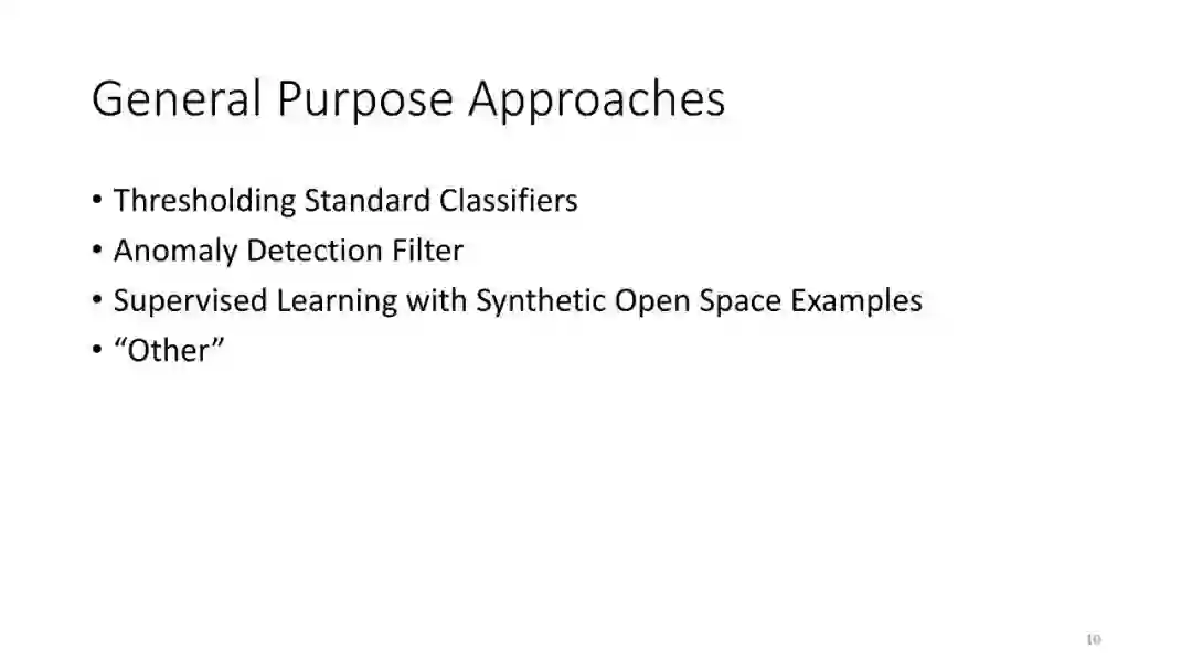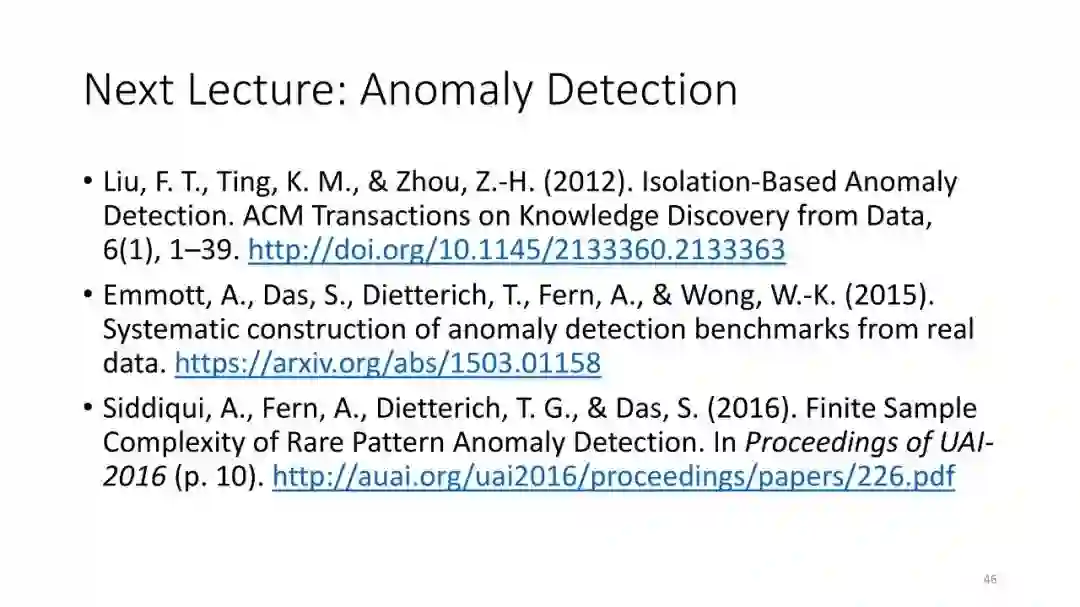 第4讲:异常检测。大多数开放类别方法都使用异常检测方法来进行新奇类查询。本节课讨论了八种异常检测算法的基准研究。然后介绍由Alan Fern,Md.Amran Siddiqui和我开发的罕见模式异常检测理论,该理论给出了异常检测方法的PAC式理论。
