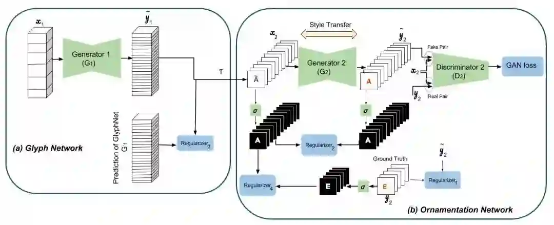 Multi-Content GAN由多个cGAN模型堆叠而成,其中一个cGAN负责预测粗略的字形形状,一个负责预测字符最终的颜色和纹理。第一个称为GlyphNet的网络预测了字形蒙版,而第二个网络称为OrnaNet,用于对来自第一个网络的生成的字形进行着色和装饰。每个子网络都遵循cGAN的体系架构,部分架构会因修饰字形、着色预测等特定目的被调整。