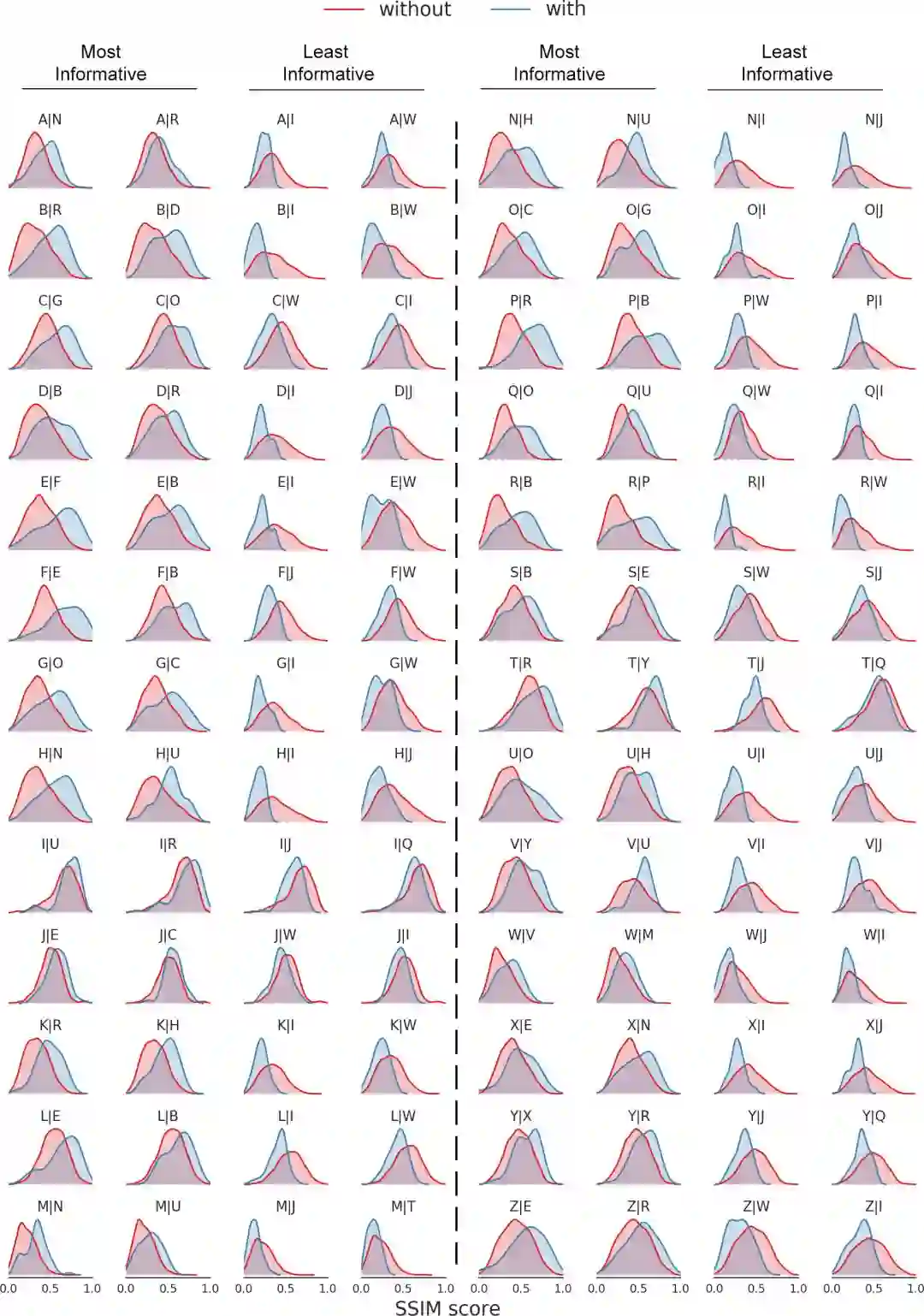 在计算每个生成字形与其相对应的基础字形之间的SSIM时,我们一次只观察一个字母就找到了25个分布。可以看到,当模型生成的字形为α时,蓝色部分是给出β时α|β的分布,红色部分则是没有观察到β时α|β的分布。图中给出了两个重合度最高的给定字母分布和两个重合度最低的分布,以第五行为例,与其他字母相比较,字母F和字母B在生成字母E时贡献最大,而字母I和W包含的信息量则最小。另外,O、C对于生成G,R、B对于生成P都有显著的建设性意义。