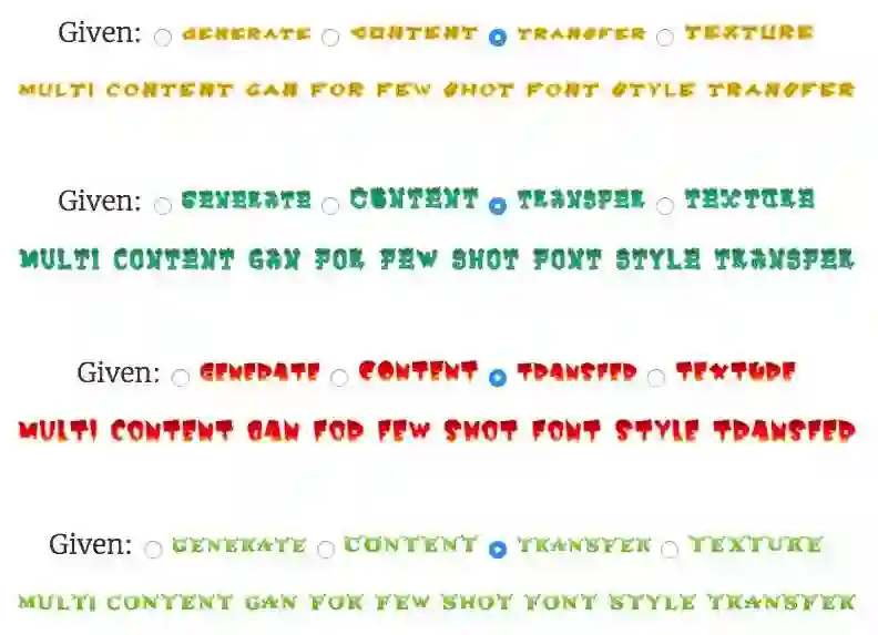 [2] Samaneh Azadi, Matthew Fisher, Vladimir Kim, Zhaowen Wang, Eli Shechtman, and Trevor Darrell. "Multi-Content GAN for Few-Shot Font Style Transfer." CVPR 2018.