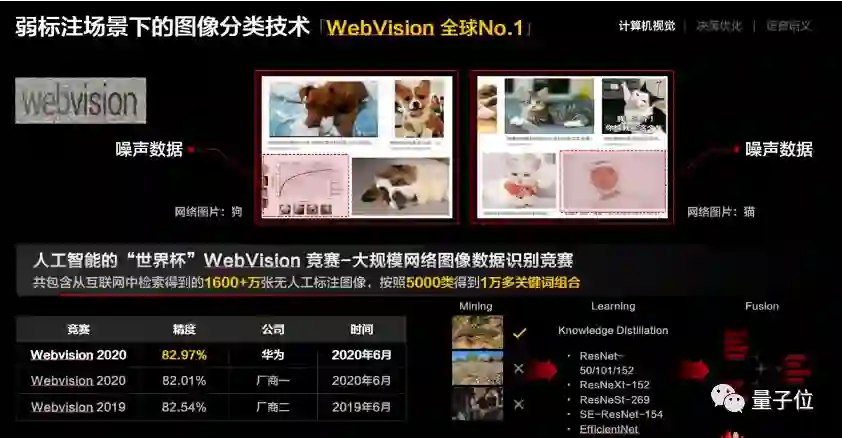 在弱监督学习方面,在刚刚结束的CVPR 2020 Webvision challenge 图像识别竞赛中,华为视觉研究团队实现了82.97% top-5识别精度,获得了此次挑战赛冠军。