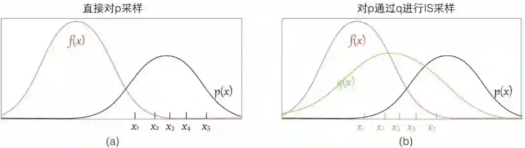 可以看到如果我们直接从 p 进行采样,而实际上这些样本对应的 f(x) 都很小,采样数量有限的情况下很有可能都无法获得 f(x) 值较大的样本,这样评估出来的期望偏差会较大;