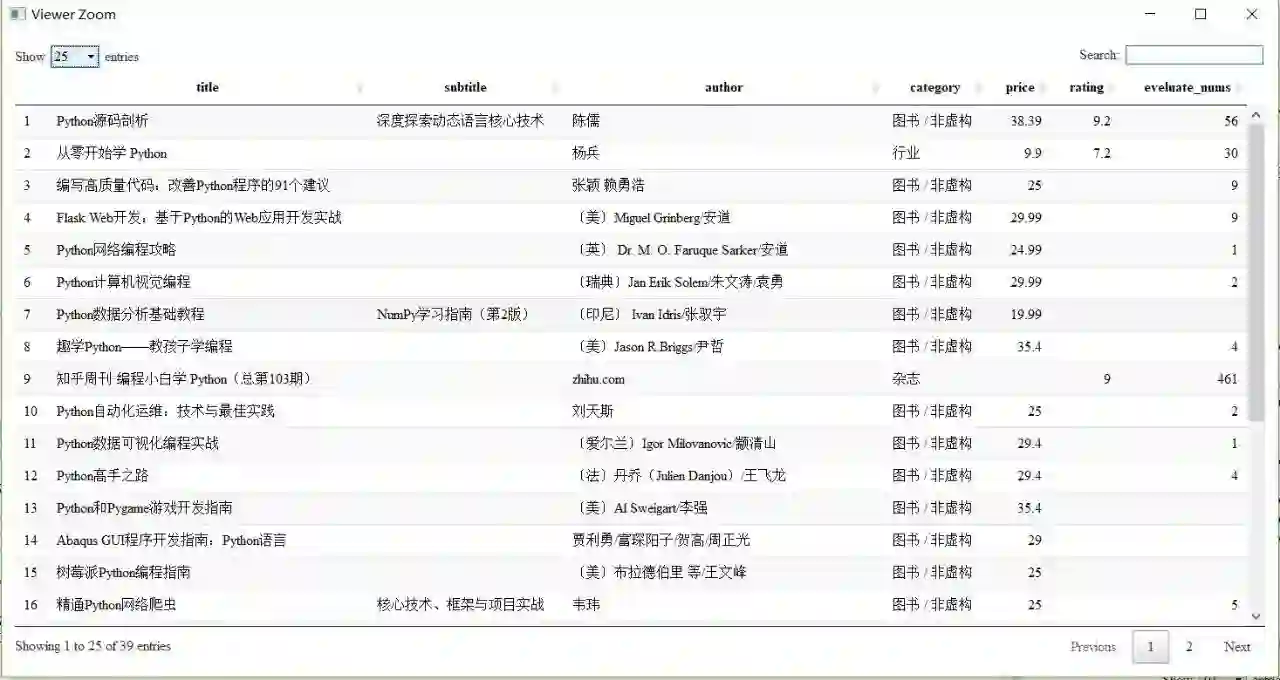 #构建数据框 myresult=data.frame(title,subtitle,author,category,price,rating,eveluate_nums)