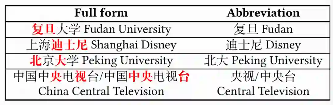 如表 1 所示,缩略词可以是位于实体完整形式中的第一个词(“复旦”)也可以是最后一个词(“迪士尼”),并且可能包含实体中一些不连续但有序的字符(“北大”)。而且,一个实体的缩略词可以有多种形式(“央视”或“中央台”)。因此,作为一项更具挑战性的任务,中文缩略词预测已成为近年来的研究热点。