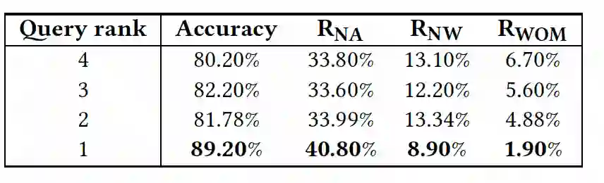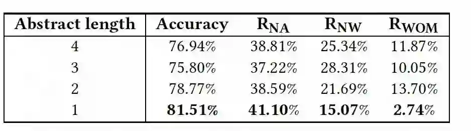 具体来说,NA 表示预测的缩略词是正确的,但和 ground-truth 的缩略词不同。NW 代表错误且语言结构异常的预测缩略词,而 WOM 代表错误但语言结构正常的预测缩略词。具体实例可见表 2。