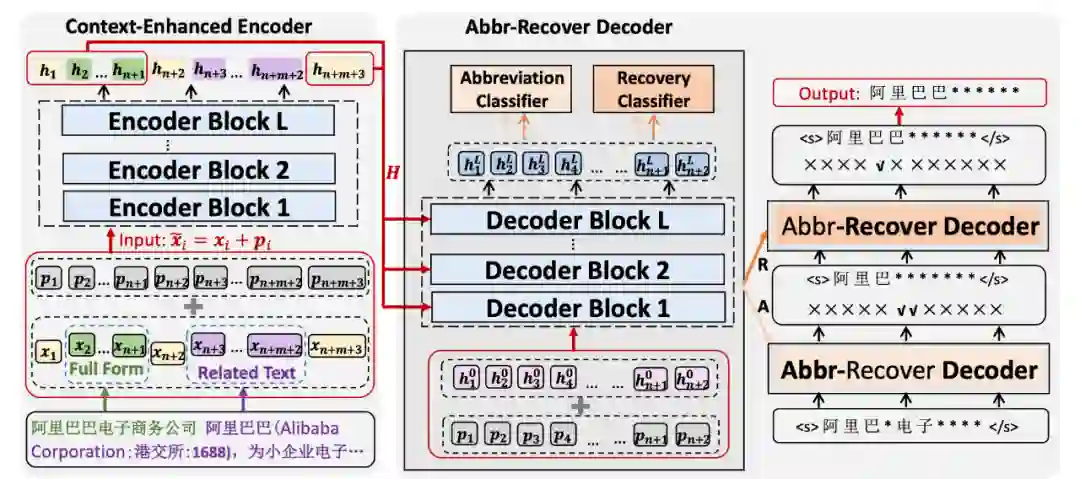 ▲ 图2:基于上下文增强和缩略-恢复策略的缩略词transformer框架图